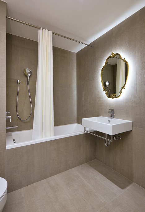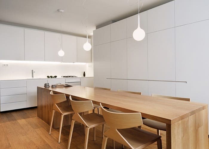 Particularmente interesante es el revestimiento de madera que se la ha dado a la entrada del apartamento, creando un bloque de armarios que continua por el pasillo que conduce al dormitorio principal. Todos los muebles de la cocina son blancos, y no tienen tiradores, sino hendiduras labradas en las puertas, al igual que en el resto de armarios de la casa. En algunas superficies se han utilizado espejos para dar sensación de mayor amplitud, como en el umbral de entrada a la sala, o en el baño más pequeño.