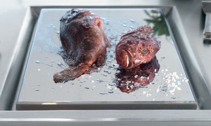 La cocina Abimis tiene todas sus aristas redondeadas, sin bordes afilados, para que sea más segura. El mueble de la encimera está hecho de una pieza, lo que facilita bastante su limpieza, y tiene un borde superior antigoteo. Este mueble ofrece también versatilidad, ya que incluye una placa eléctrica de inducción, fogones a gas, y una placa de acero para cocinar teppanyaki. En lo que a almacenamiento se refiere, destacan los cajones para guardar alimentos según la temperatura: refrigerados, frescos, o a temperatura ambiente. También sorprenden las soluciones modulares de bandejas y cuencos, que encajan perfectamente en el fregadero, así como en los cajones y armarios.