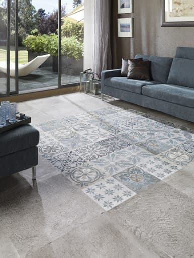 Con el suelo hidráulico Porcelanosa se pueden crear bellas composiciones. Similares a las que se hacían en las casas antiguas. Es fácil crear tapices enmarcados con baldosas lisas de la colección Park, que tienen los mismos tonos base.