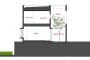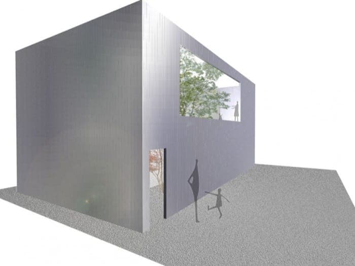 Todo el exterior está revestido de paneles metálicos, estableciéndose un contraste con el interior, que es de madera y paredes blancas. Junto a una cocina bastante minimalista, encontramos también un diseño muy ligero de escalera metálica, y unas puertas correderas que permiten tener un gran hueco abierto hacia el patio. Un dato curioso es que se ha dejado una banda lateral del suelo del salón con un acabado de cemento pulido, y unos centímetros por debajo del resto, que es de madera.