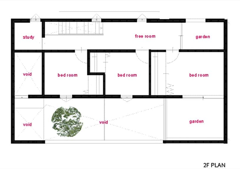Este espacio vacío también asegura la ventilación cruzada e iluminación natural tanto del salón y cocina (en planta baja) como de los dormitorios, que están en el piso superior. Como dato curioso, hay que hacer notar que esta vivienda tan solo dispone de un cuarto de baño, y que está situado en la planta baja. En vez de poner otro arriba, junto a los dormitorios, se utilizó la superficie restante para configurar dos terrazas o jardines interiores, y un pequeño estudio.