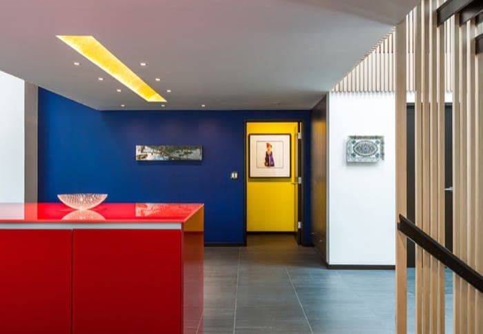 El espacio interior presenta diferentes alturas y está decorado en varios colores. Además es muy interesante la entrada de luz natural. Se hace a través de grandes ventanales, lucernarios, o tamizándola con celosías de madera. La Residencia Koosmann deja el típico espacio en planta baja para la cocina, comedor, y la sala (esta última con doble altura). En el piso de arriba hay dos dormitorios simétricos que comparten un cuarto de baño. También encontraremos una sala de estudio que se asoma al hueco de la escalera y al que hay en el salón. El dormitorio principal es una suite, y se ha situado en la planta baja. La planta sótano tiene un gran salón con chimenea, almacén, baño, sala de máquinas, y otro dormitorio.