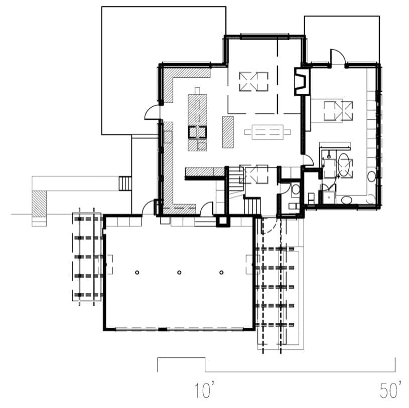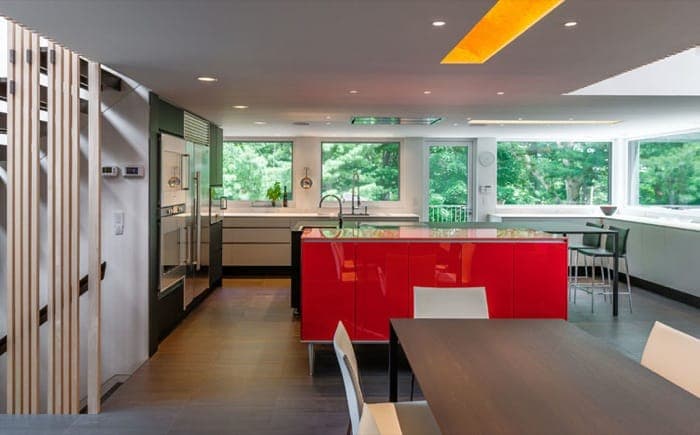 La Residencia Koosmann se construyó a partir de un antiguo edificio, ubicado cerca del río Saint Criox (Minnesota, EE.UU.). Aquella casa tenía graves problemas de humedad y de calidad del aire. Para el nuevo diseño, los arquitectos pudieron aprovechar la cimentación y algunos elementos de albañilería. De es manera consiguieron una vivienda en ladera de tres plantas, una de ellas en semisótano.
