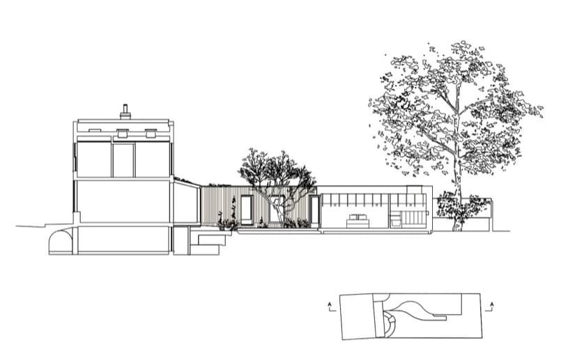 El objetivo de esta remodelación era conectar las habitaciones originales del piso bajo, y añadir un nuevo dormitorio con cuarto de baño dentro. Era preciso conectar también con el jardín, donde la accesibilidad debía ser un punto fundamental. La solución pasó por construir esta Tree House, que está pegada a un lateral de la parcela. Su trazado va serpenteando los árboles y estrechándose. para salvar un zumaque central. Luego se ensancha para dar cabida al dormitorio junto a un eucalipto.
