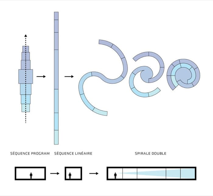 BIG explicó con unas estupendas axonometrías la génesis de este edificio. La forma en espiral es el contenedor del programa, que incluye las galerías y los talleres, siguiendo una secuencia lineal con un recorrido de ida y vuelta. A su vez se conecta a un espacio situado en el nivel superior del antiguo edificio. El mismo extremo de la hélice es punto de entrada y salida para los visitantes. La parte más intrigante del proyecto la encontramos en la estructura que forma el pabellón del museo. Está formada por una cubierta con lámina de acero chapado en latón, soportada por una fachada curva de vidrio estructural, según se indica que en el siguiente dibujo.