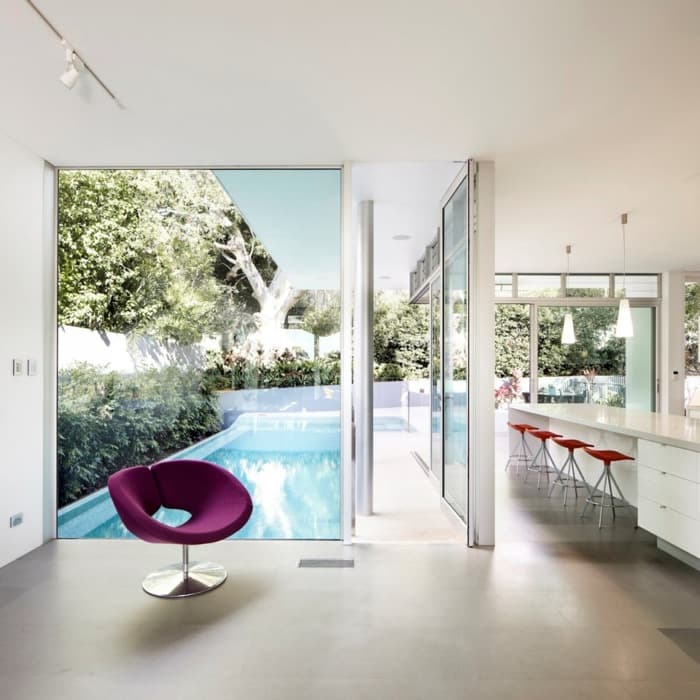 En esta vivienda se han utilizado revestimientos con losas de piedra arenisca, de textura gruesa para la zona de acceso, y más fina para el interior. Nos han gustado mucho los finos detalles en madera, acero, y piedra que se ven en su interior, un ejemplo de ello es la escalera principal (de madera). En líneas generales, se trata de un edificio con fachadas muy transparentes, pero que en otros puntos protege bastante bien la privacidad de sus ocupantes.