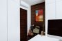 El resultado así lo demuestra, pues con paneles laminados, azulejos, y yeso, se ha conseguido una decoración impactante, moderna y elegante. La elección del mobiliario y lámparas tampoco desentona en este apartamento, en el que hay que atravesar (literalmente) la cocina para acceder a las habitaciones.