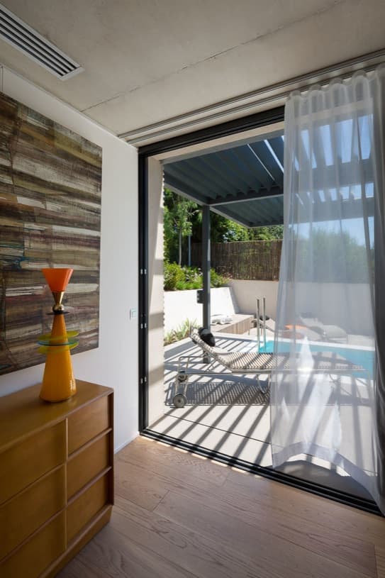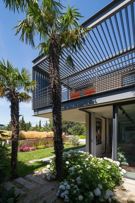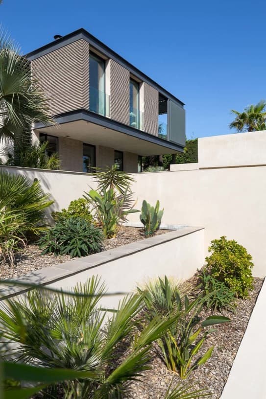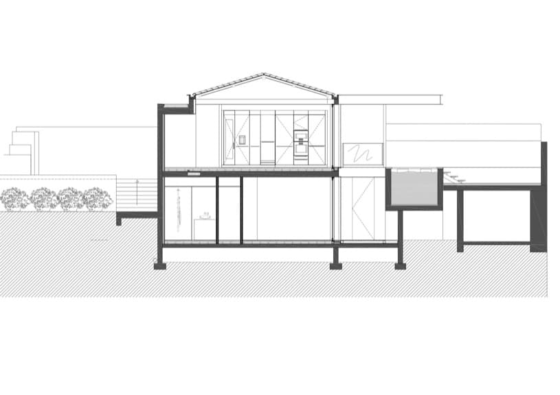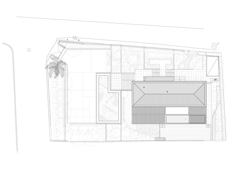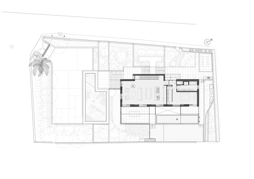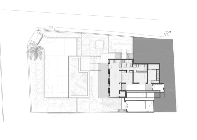 El perfil de la casa está resuelto para adaptarse a la inclinación de la topografía. Por eso se colocaron las habitaciones vivideras (y el dormitorio principal) en el piso superior, incluso hasta una piscina alargada. El resto de dormitorios y dependencias están en la planta inferior. La parte más baja del jardín está presidida por una habitación que, muy acertadamente, se ha rematado con una cubierta ajardinada.