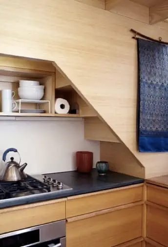 Toda la reforma de este Apartamento en Manhattan es un trabajo magistral de acabado en carpintería. Hay armarios de ciprés y bambú, una escalera de haya, suelos de roble blanco, un escritorio hecho con listones de abedul que se desliza hacia la sala. En muchos rincones se puede ver cómo parte de la iluminación está tras unos papeles de papiro,… Todo está realizado con suma delicadeza, aportando al apartamento una gran calidez. Es como vivir dentro de un trozo de madera labrada.