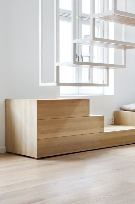 Bajo dos de las ventanas del comedor se ha dispuesto un mueble de madera con grandes cajones, que además sirve como banco para sentarse a comer, y como los tres primeros peldaños de la escalera.