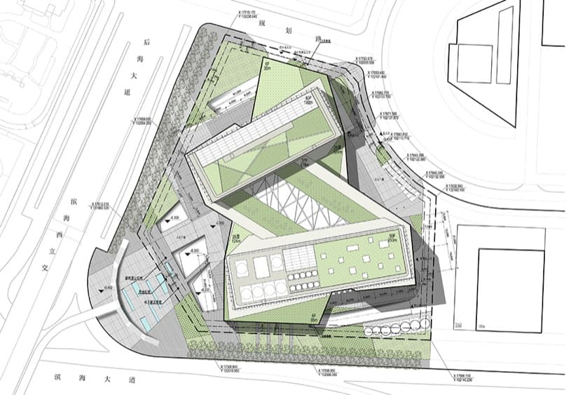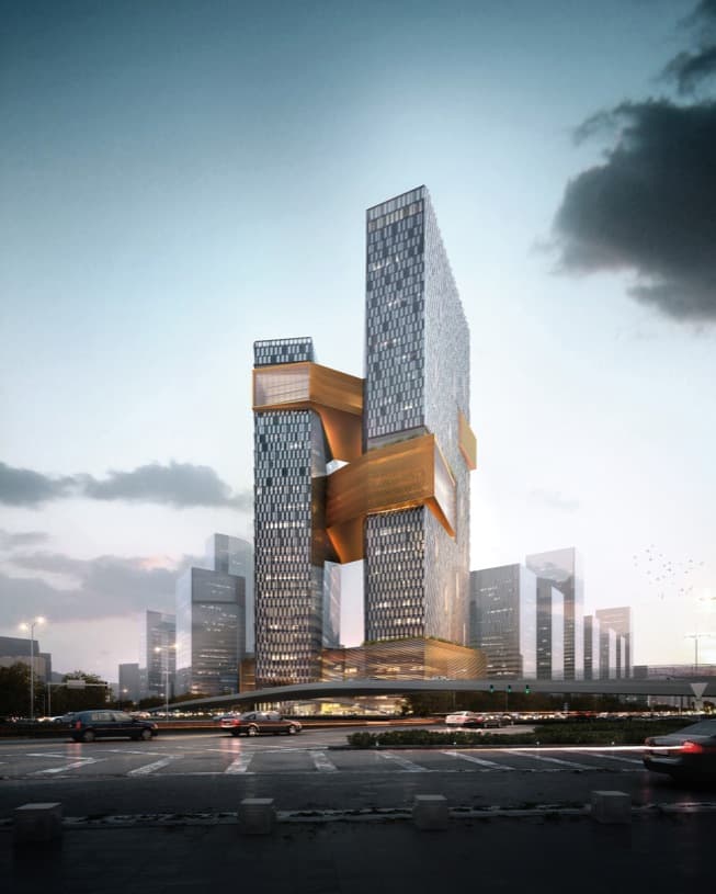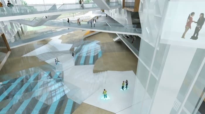 Estas imágenes renderizadas y estupendo vídeo son del proyecto para la nueva sede de la compañía Tencent*, en la ciudad china de Shénzhen. Es un Parque Industrial de Alta Tecnología con capacidad para 12 mil empleados. Los dos rascacielos (250 y 192 metros de altura) de este nuevo campus están unidos por tres puentes, en diferentes puntos, con el fin de activar el flujo de movimiento entre ambos edificios. Cada puente trata sobre una temática particular, de tal manera que el más alto se centra en el tema del ‘conocimiento’. Tiene salas de conferencias y otros servicios vinculados al aprendizaje. El segundo rascacielos está enfocado a la ‘salud’. Por eso está equipado con canchas de baloncesto, piscina, y otros programas que ayudan a mantener en buena forma a los trabajadores. El tercer puente funciona como una extensión de las actividades situadas en la base de los rascacielos.