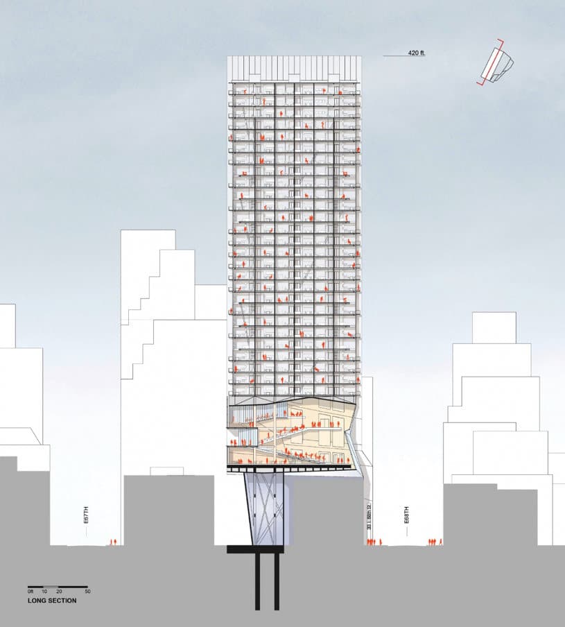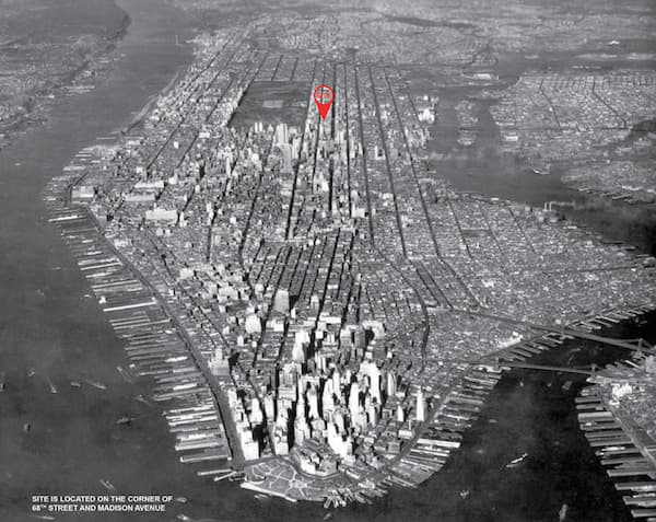 Este rascacielos tiene su ubicación en el Midtown Manhattan. En la confluencia de la calle 68 con la avenida Madison, en un solar rectangular de unos 5.5 x 21 metros. Pero a pesar de esas limitaciones, su estructura se expande cuando supera la altura de las construcciones vecinas, hasta alcanzar una superficie de 400m2 y una altura de 128 metros. Llegados a este punto, es imprescindible estudiar los planos de sección para comprender el proyecto.