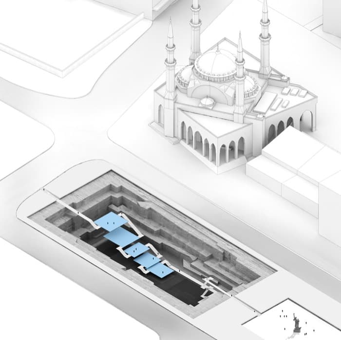 Estos renders tienen que ver con el diseño para el Museo de las Civilizaciones. Se ubica en la Plaza de los Mártires, en pleno corazón de Beirut (Líbano), junto a una estatua colocada en 1960, y la mezquita de Mohammed Al-Amin. Esta instalación cultural está hundida en una excavación que atraviesa diferentes estratos de tierra, procedentes de la presencia griega, romana, bizantina, otomana, y francesa. Lo mejor de todo es el lenguaje tan neutro que utiliza, y con tan pocos elementos.