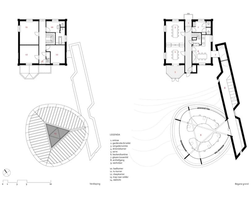 La villa se rehabilitó respetando su aspecto original, para albergar una sala de conferencias, oficinas, y un espacio residencial en la primera planta para huéspedes extranjeros. Pero el lugar de trabajo principal se ha dispuesto en un nuevo pabellón situado en los jardines, de forma redondeada (no circular exactamente), y levantado sobre una losa de hormigón. Tiene estructura de madera, que forma un cruce visible de vigas en el techo, y cubierta de chapa metálica con una claraboya central.