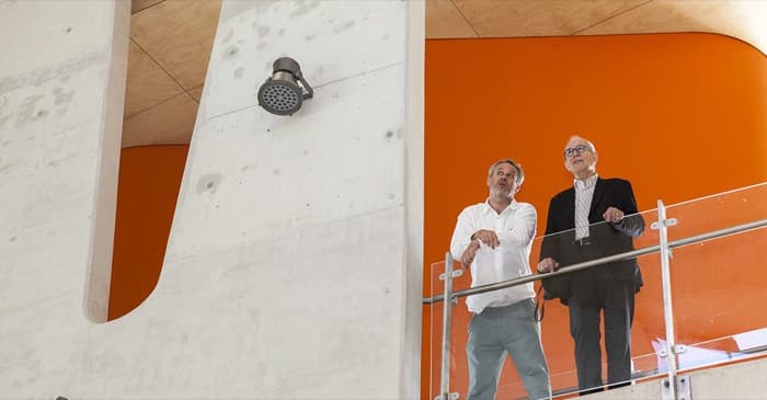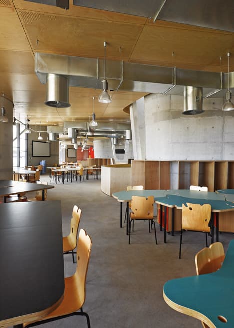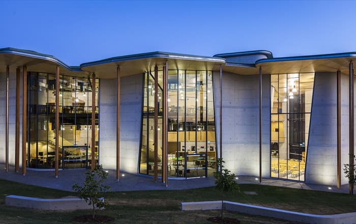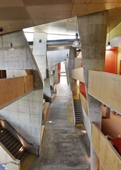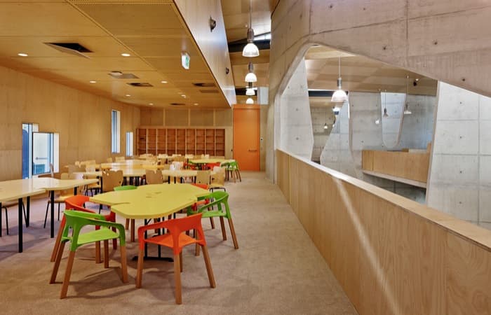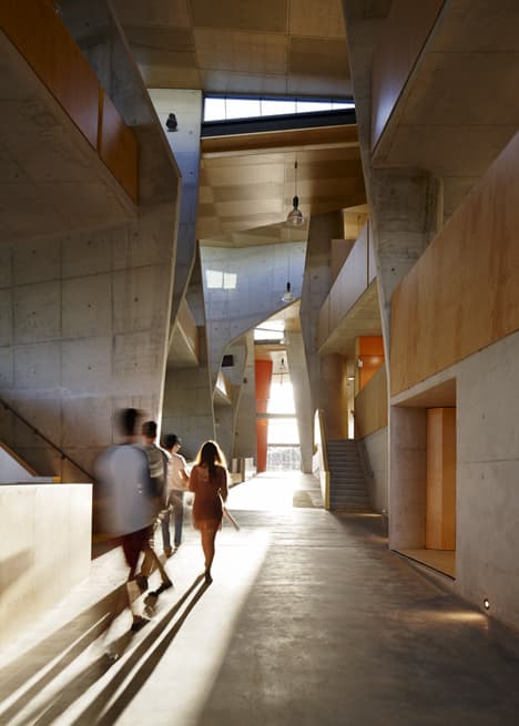 En el edificio se han diseñado diferentes entornos de trabajo informales, así como espacios dedicados a la enseñanza, con sala de reuniones en ‘cuevas’ más pequeñas. A pesar de su complicada geometría, el diseño de estas instalaciones facilita la entrada de mucha luz natural a su interior. Pero lo mejor de todo son sin lugar a dudas las pantallas curvas de hormigón, que además muestran su textura natural. Para completar el diseño de su interior, se han incorporado muchos revestimientos y elementos de madera, y algún que otro mueble diseñado expresamente para el edificio.