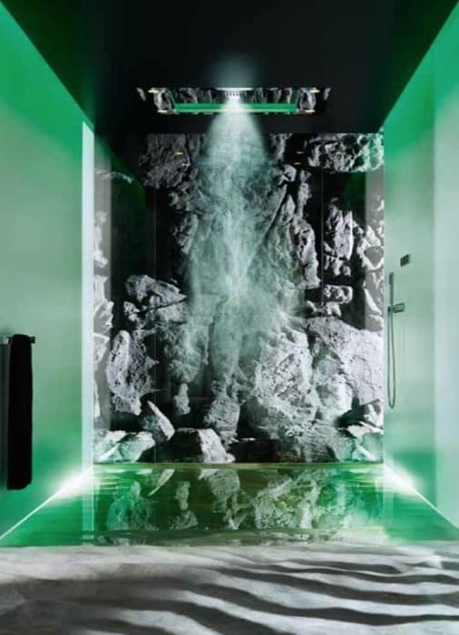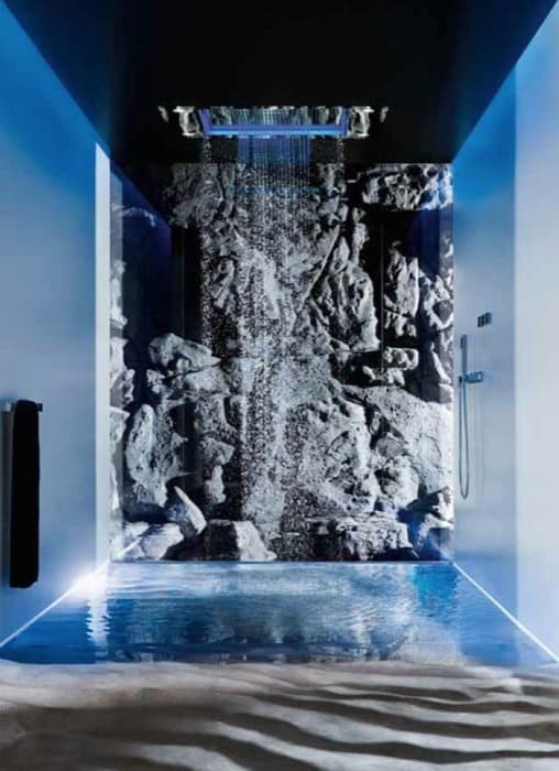 En el vídeo se muestra el funcionamiento de alguna de estas escenas. No queremos pasar por alto el excelente e innovador diseño de ducha que se ha preparado para hacer esta grabación. Hay una pared de rocas tras el cristal del fondo, y una base de arena en la lámina de agua, incluida fuente de luz perimetral. Woooww!