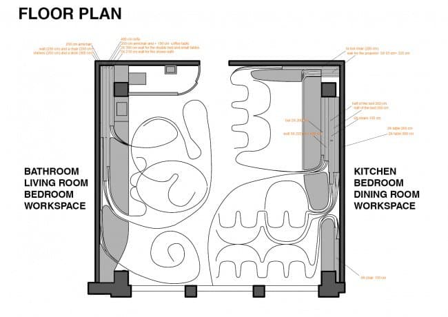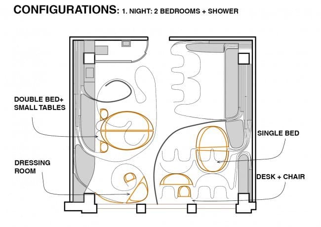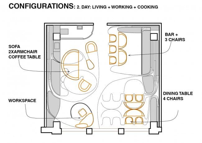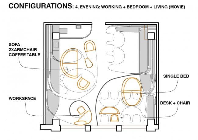 Se ha empleado el polipropileno, por su ligereza y la facilidad con la que se puede doblar y cambiar de forma, mediante unas líneas practicadas en su superficie. Con este material se ha podido diseñar las sillas, mesas, la cama, sofá… Todo el conjunto ofrece una gran variedad de configuraciones diferentes, tanto para el día, como para la noche. Incluso es posible dejar toda la superficie despejada si se quiere. Viendo el vídeo se entiende perfectamente la idea. Bajo el piso existen varias capas, algunas de ellas bastante complejas.