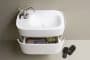 La colección incluye una bañera hecha en Korakril, que es un material compuesto por resinas y minerales. También hay varios modelos de lavabo, tanto de pedestal como encimera; ducha con mampara, espejos, cajas, taburete, caja para la ropa,… Todos están fabricados en material Corian y madera de olmo maciza. Hay que destacar el detalle del marco corian en los espejos, pues se convierte en un estante de apoyo. Es interesante el panel de vidrio curvo de la ducha, que va empotrado en la base para evitar que el paso del agua. En la misma línea, nos ha sorprendido el taburete, pues el elemento blanco que sirve de asiento también se puede utilizar como cuenca (si le damos la vuelta) para lavarnos los pies; o el cubo para la ropa, que incorpora una preciosa percha de madera.