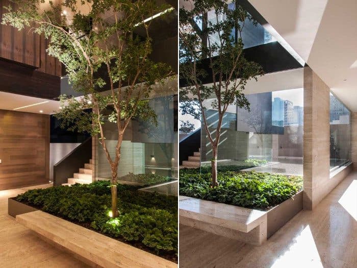 Una vez dentro de la casa nos toparemos con uno de sus detalles más impactantes: el vestíbulo principal. Este espacio se organiza en forma de L; por un lado está la escalera principal, que es de ida y vuelta, y está bastante acristalada; el resto está ocupado por un patio, con jardín y árbol incluido. Según los planos de planta, y la pequeña sección que se puede ver en una de sus esquinas, este patio tiene doble altura. Hay otro patio más justo encima, en la última planta.