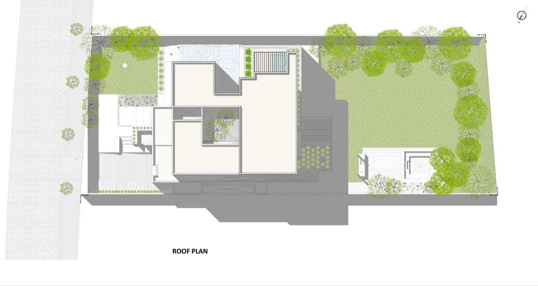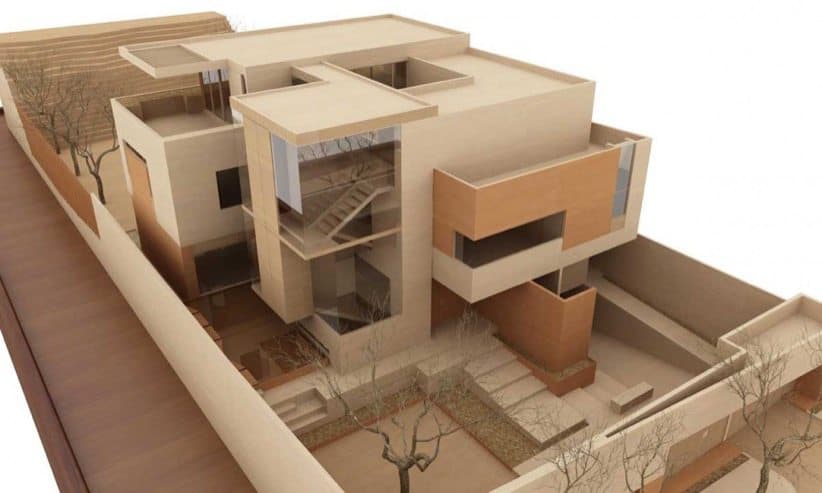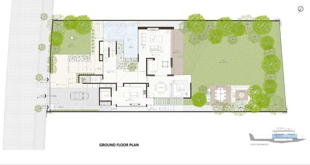 Este proyecto tiene muchos puntos sobresalientes que hay que señalar. Destaca la separación del edificio con respecto a la calle, que es la adecuada para que la rampa de bajada al garaje no sea excesiva. El espacio delantero se ocupa con un jardín y camino recto escalonado (suave) de entrada a la vivienda. No se ve en ninguna foto, pero sí en la maqueta (más abajo). El patio trasero del edificio es un jardín (sin piscina), con un área para comer y relajarse al aire libre, protegida con un toldo.