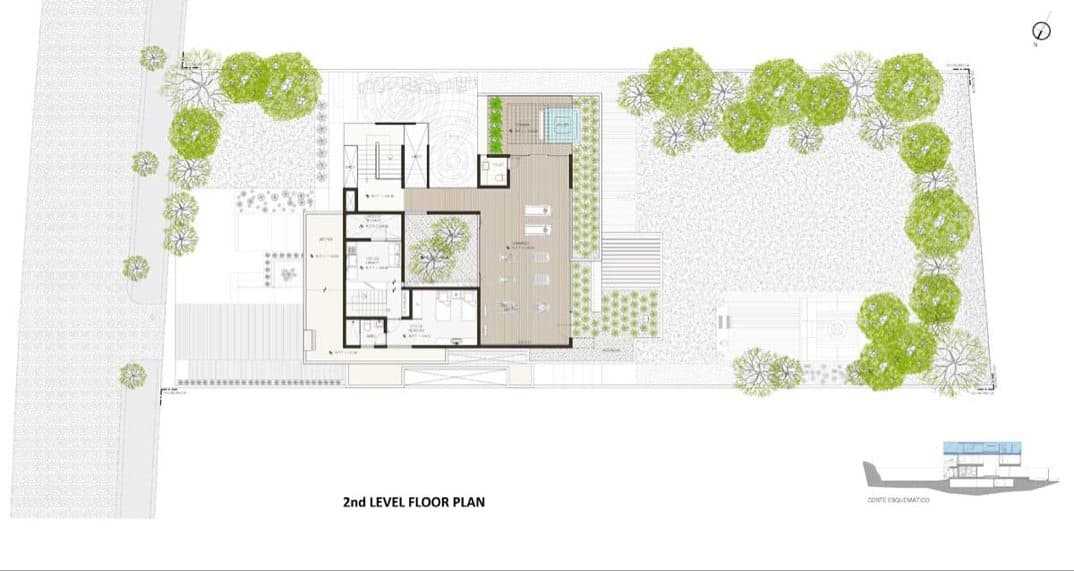 El único dormitorio que hay en la planta segunda es el destinado al personal de servicio (con terraza y baño propio), recordemos que es accesible desde la escalera secundaria. Esta parte de la vivienda también está destinada a la zona de lavado de ropa. Por eso dispone de un pequeño patio para el secado de la ropa. Se completa el programa con un gimnasio, aseo, jacuzzi, y otro patio con dos árboles.