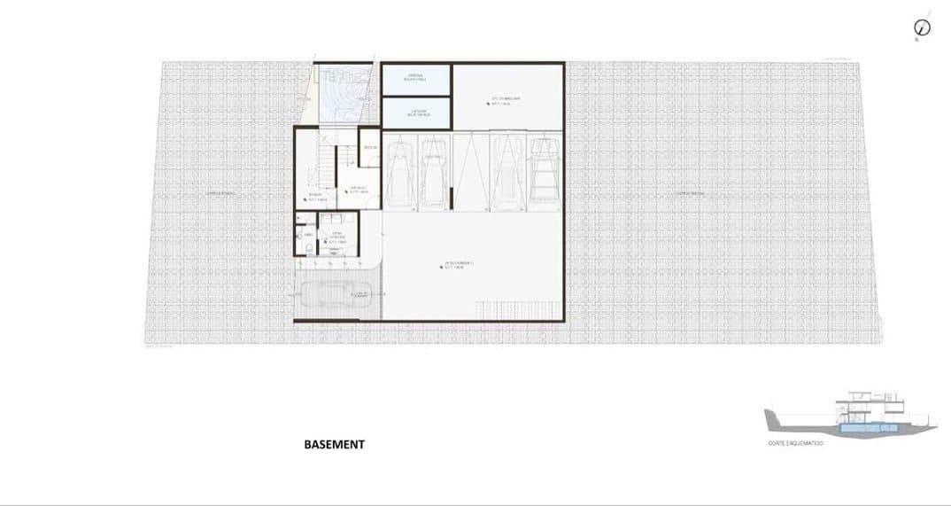 El sótano tiene capacidad para que cinco vehículos puedan aparcar, y sorprendentemente está bastante despejado de soportes. Suponemos se ha utilizado algún pilar apeado en plantas superiores, o algún otro método constructivo que permitiera salvar esas luces. Dispone de espacio suficiente para cuartos de instalaciones, taller, y aseo.