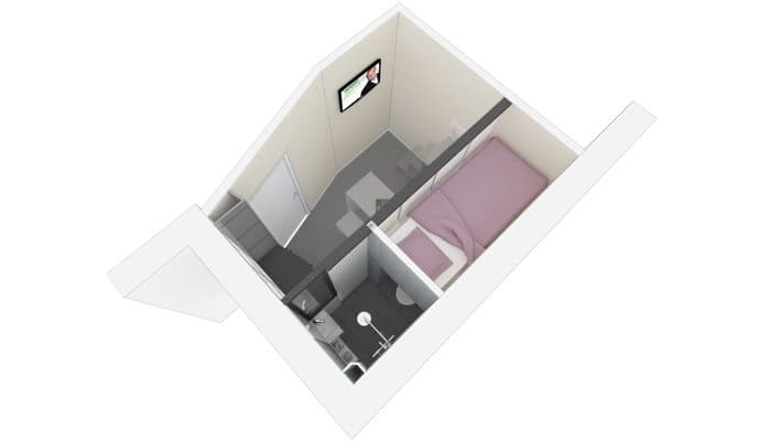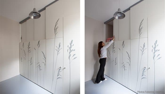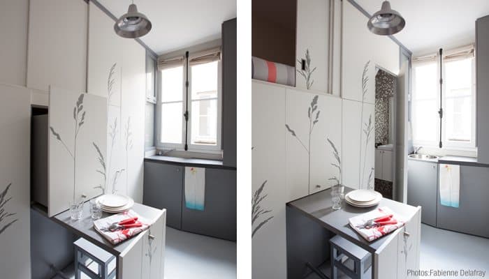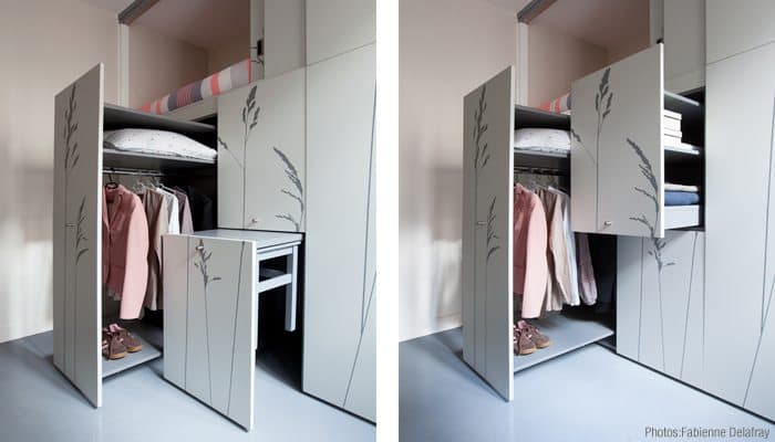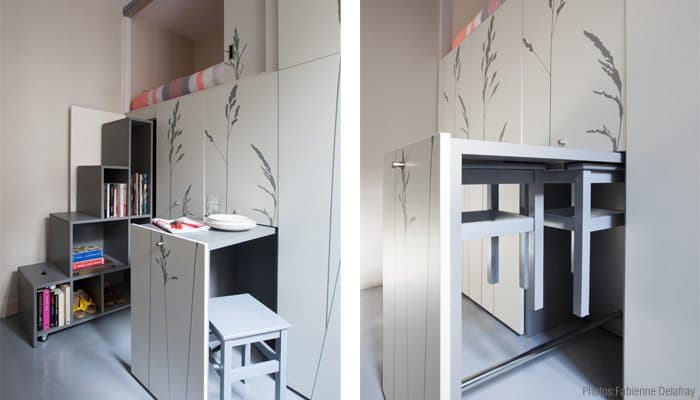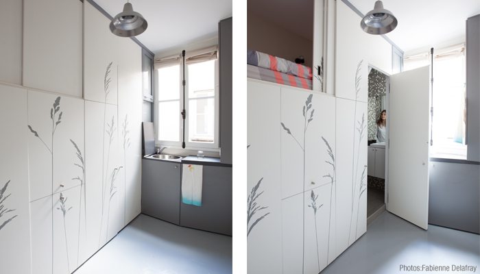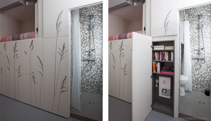 El proyecto de esta habitación parisina consistió en acondicionar el escaso espacio disponible para que una persona pudiera vivir. Debía funcionar con la precisión de una navaja suiza, y tener espacio de almacenamiento. Y eso fue lo que se hizo, encajándolo casi todo en un único mueble. En realidad se trata de un contenedor de muebles, armarios, y puertas, perfectamente ordenados.