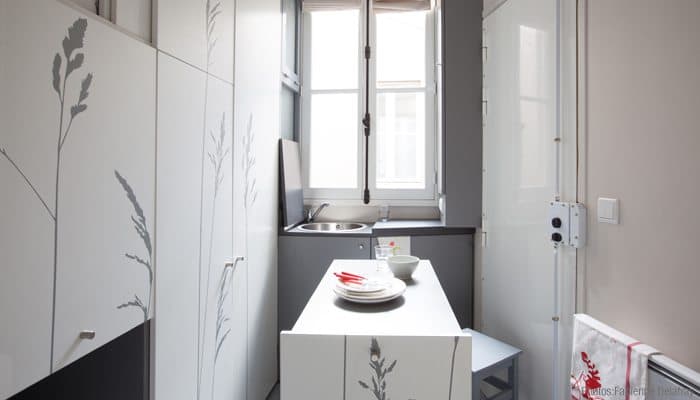 La cocina ocupa todo el frontal de la ventana. Tiene un mueble bajo, y otro alto al lado de la puerta de entrada al apartamento. El fregadero puede estar tapado por un tablero abatible, lo que aumenta las posibilidades de uso.