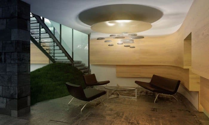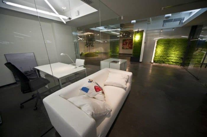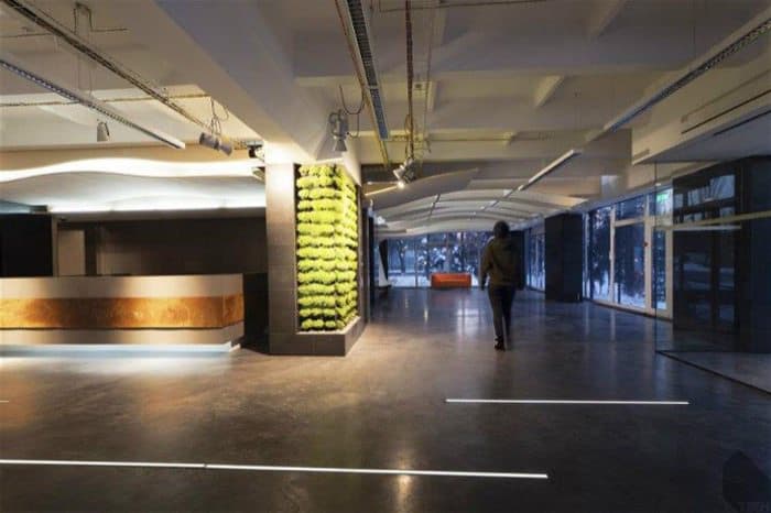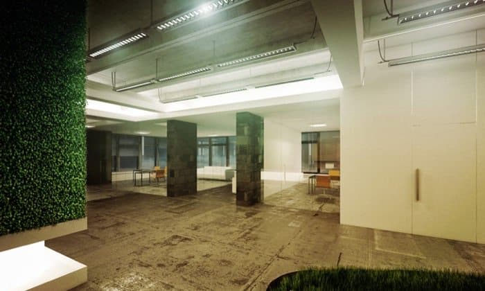 El verde aparece en diferentes superficies y de distintas maneras. Se hizo formando dos columnas en la sala de recepción, creando un cubo de césped, instalando pequeños jardines verticales, arbustos primaverales colocados en la terraza, o formando micro-colinas con árbol en medio de un suelo de hormigón. Este estilo nos recuerda a los jardines interiores hechos con Terramac.