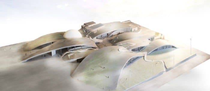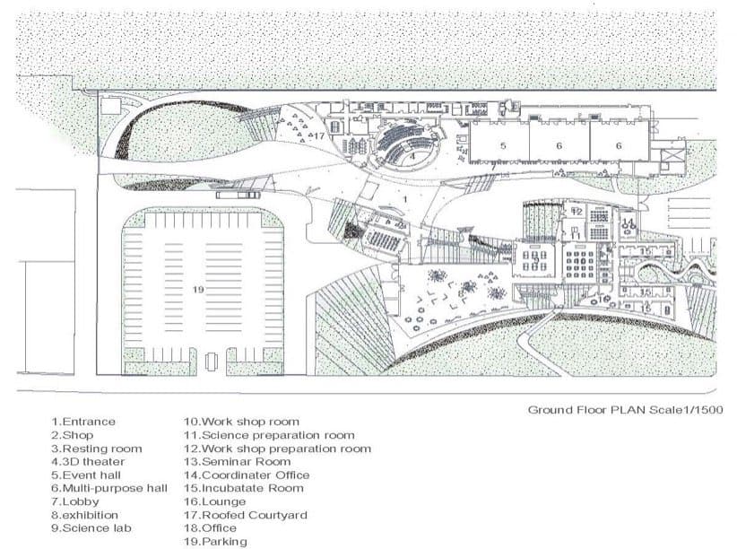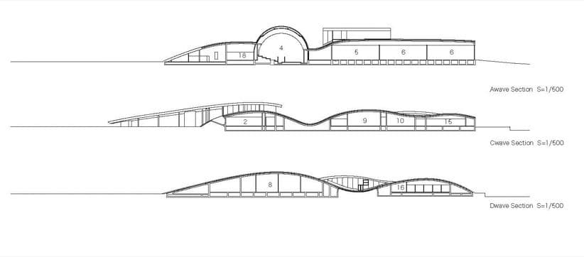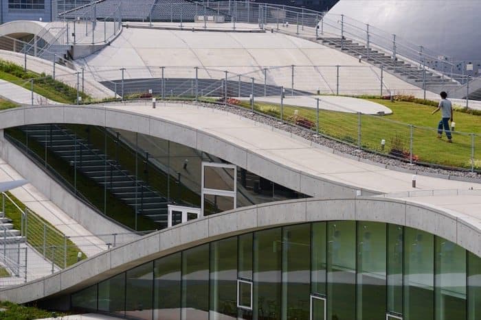 La estructura de este recinto cultural está formada por cuatro grandes losas de hormigón armado. Siguen un trazado ondulado, pero con diferente ritmo entre sí. Mantienen una altura baja, en consonancia con la de los edificios de su entorno. El program del Museo de la Ciencia se desarrolla bajo este ‘oleaje’, y está presidido por una sala esférica, pensada para la proyección de contenidos 3D. Hay también un centro de aprendizaje, otro de promoción de la industria local, además de un centro de incubación. Pero sin duda lo más llamativo de este Science Hills Komatsu son las praderas que se han sembrado en sus cubiertas. Son accesibles desde el acerado exterior, y suponen una ayuda natural que mejora el aislamiento del edificio.
