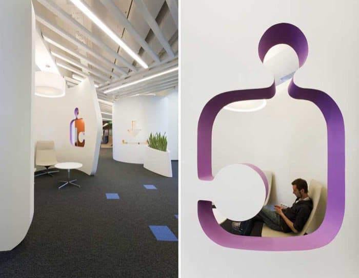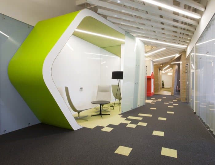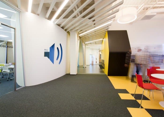 Ni el logotipo de Yandex, ni ninguno de los iconos relacionados con los servicios que ofrece, utiliza la paleta de colores de estas instalaciones. Más bien ha sido al contrario. Se han creando oficinas y salas de reunión con un aspecto desenfado e infantiloide. El mismo que podríamos encontrar en las instalaciones de cualquier edificio de Google. Pero esta vez la paleta de colores es más amplia, y en ningún momento se restringe a la de Yandex, donde predomina el amarillo, rojo, y el negro. Tampoco queremos decir con ello que la decoración de las oficinas de una empresa tenga necesariamente que hacerse bajo ese criterio, pero creemos conveniente señalar ese matiz.