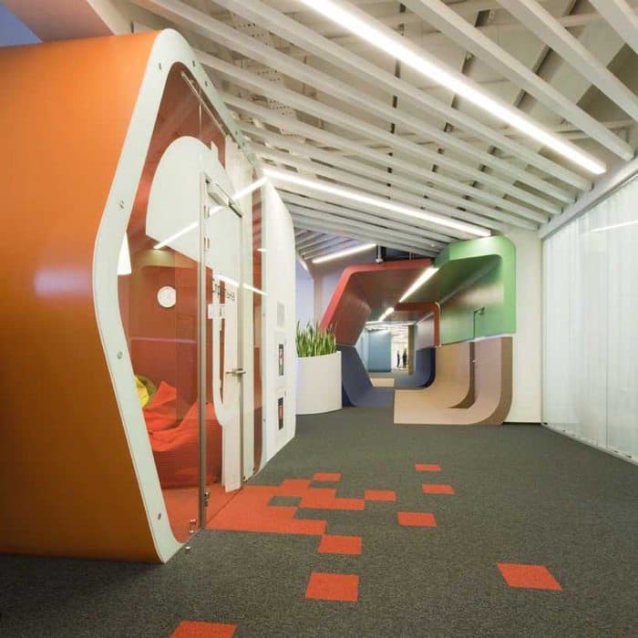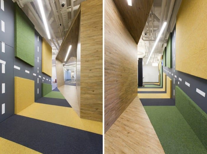 Estas imágenes corresponden a un proyecto de interiorismo para unas oficinas en San Petersburgo (Rusia). Lo cierto es que no resulta difícil adivinar de qué tipo de compañía se trata. Los responsables de este trabajo dejaron muy claro a qué se dedica la gente que trabaja aquí. Por eso tomaron prestada la imagen de la empresa líder del sector (Google) solo que en esta ocasión se trata de las oficinas del buscador Yandex.