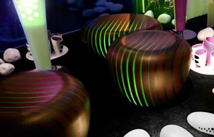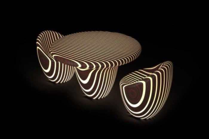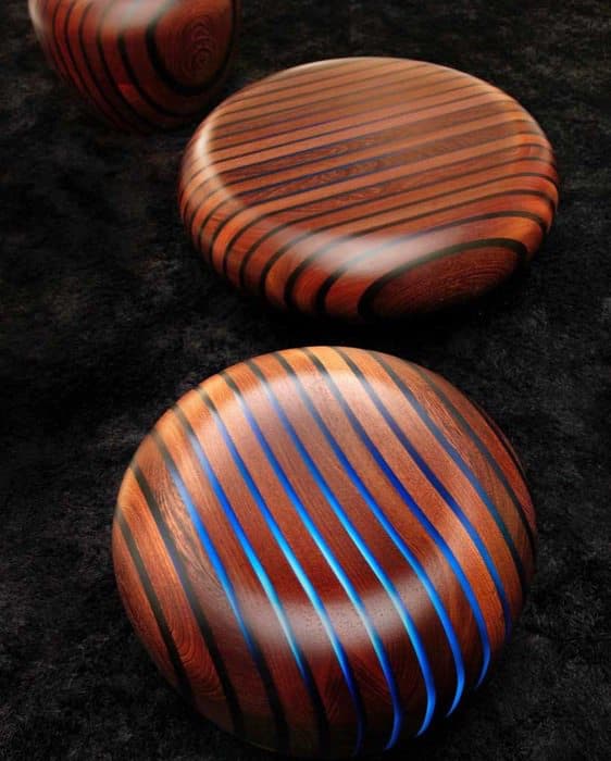 Para su fabricación se utilizó madera maciza, y se le dio la forma deseada. Luego se le practicó una serie de cortes paralelos. La mitad de esos anillos desaparecieron para ser rellenados con resina translúcida. El resto es obvio: batería que alimenta a una iluminación LED que puede cambiar de color y de intensidad. El resultado no puede ser más espectacular. Es digno para cualquier ambiente exclusivo que tenga una decoración de interiores de altura. Bien puede valer para ámbitos residenciales o comerciales (un hotel, por ejemplo). La colección Bright Woods es de producción limitada (firmada y numerada) y está valorada en 50.000€.