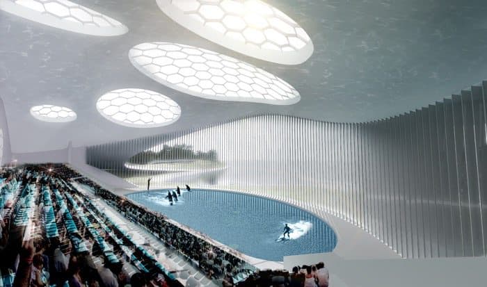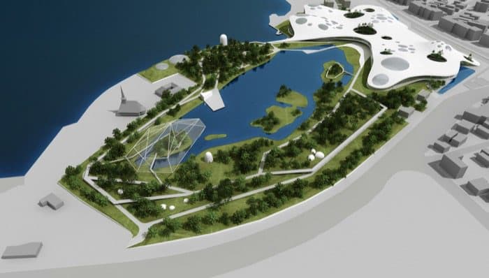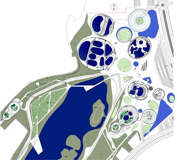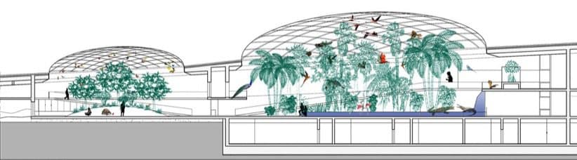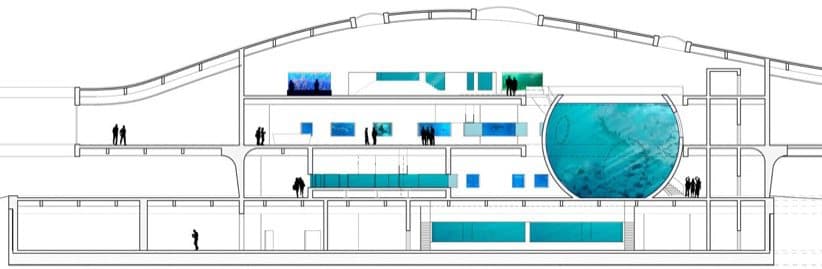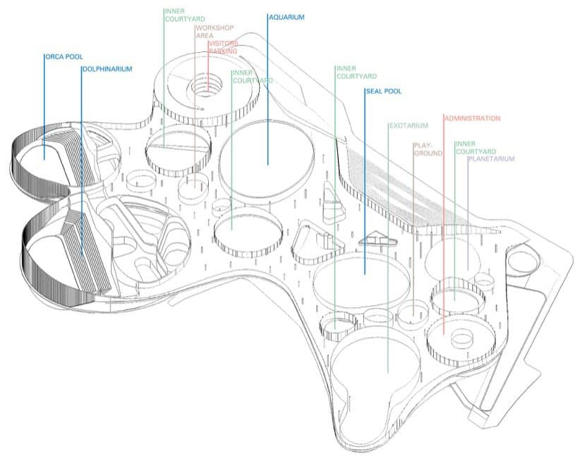 En estas instalaciones hay una terraza que funciona como plaza urbana que conecta el complejo con la ciudad; y un parque anexo, con lago incluido. Hay que decir que su acuario se extiende en tres niveles, y dispone de un total de nueve piscinas. El oceanario y el delfinario son las atracciones más potentes, con una piscina de 30 metros de profundidad que sirve de escenario para las orcas. [Ver planos de sección más abajo].