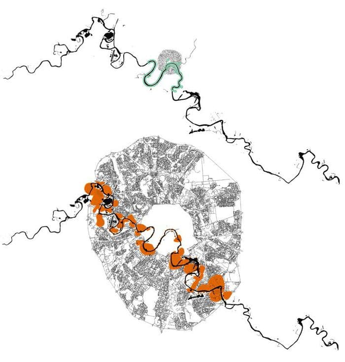 La propuesta plantea una estrategia a lo largo, ancho, y alrededor del río Moscova, para actualizar y mejorar toda la infraestructura de transportes. De esa manera el metro, autobús, tranvía, fluvial, peatonal y bici, se ven beneficiados. Esto implica la creación de puertos conectados entre sí mediante un ferry y embarcaciones rápidas. El plan también sirve para transformar diques en espacios públicos a la largo del río. Con esta estrategia se consigue espacios para el desarrollo de actividades culturales, creativas, y educativas. Un ejemplo de ello es la propuesta para la zona de Stroginskaya: áreas verdes con 6 instalaciones deportivas y recreativas.