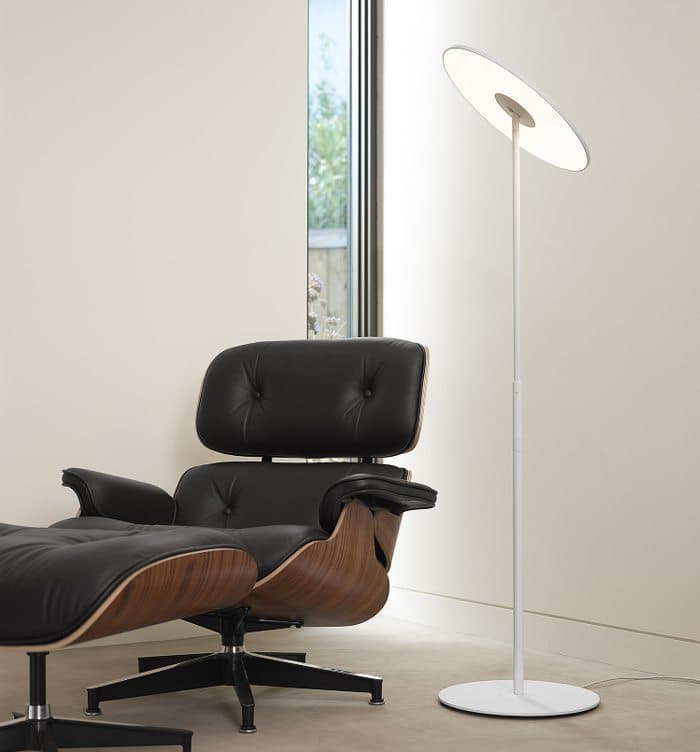 El elemento clave en su diseño es un disco LED que en su centro tiene dos libertades de movimiento. Esto permite que se pueda inclinar 45º, y orientar en 360º (ver vídeo más abajo). Es por tanto muy fácil modificar la orientación de la emisión de la luz. Cualquiera de estas lámparas va a poder funcionar como una lámpara de trabajo, y ofrecer una luz ambiental muy equilibrada. Además, tiene la ventaja de que su intensidad se puede ajustar desde el propio interruptor.