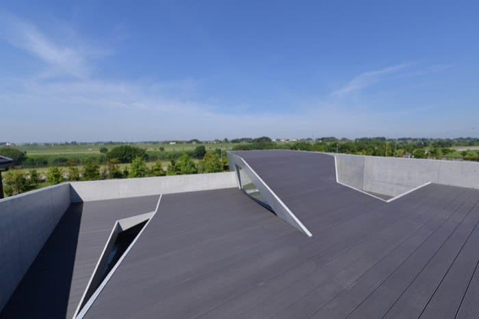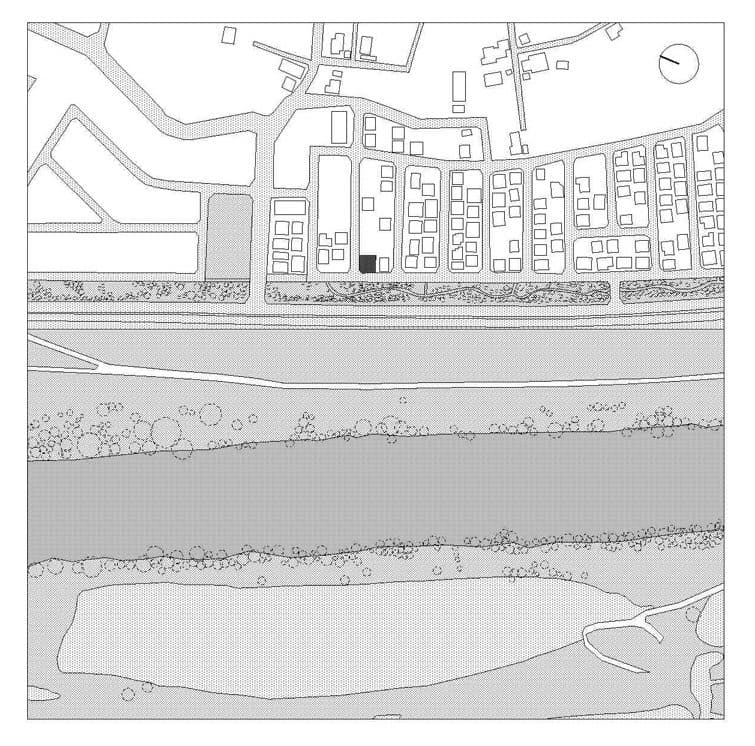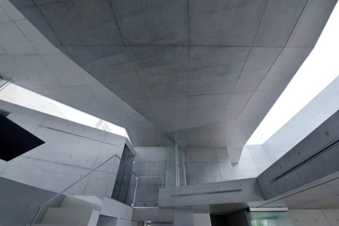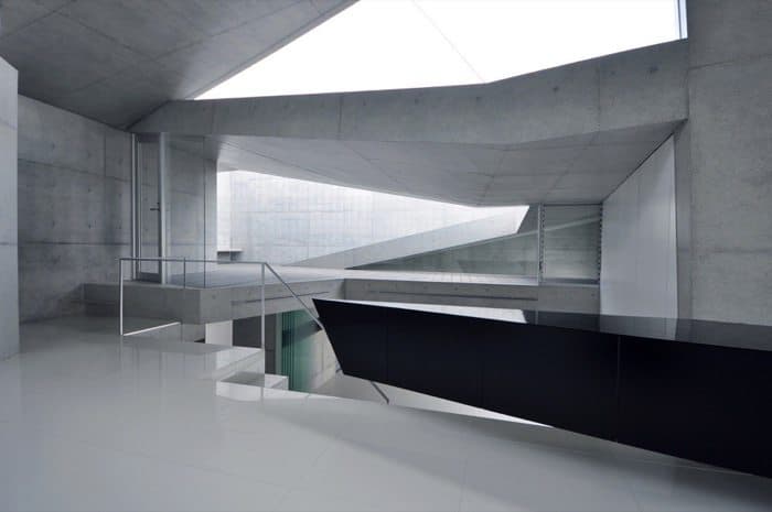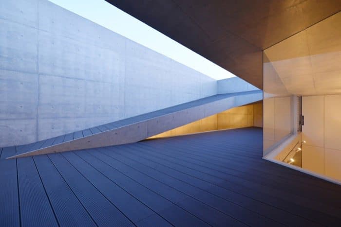 La casa tiene buenas vistas hacia el cauce del río Edo y un estrecho parque que pasa justo por delante de ella. Ese es el motivo por el que se ha colocado la gran ventana en la fachada del lado oeste. Hay más huecos a la calle, pero todos son estrechos y verticales, estando localizados en el dormitorio, cocina, y aseo. ¿Significa esto que el interior de esta vivienda es oscuro? en absoluto. El arquitecto resolvió con gran maestría este aspecto colocando grandes paneles de vidrio entre las diferentes losas de hormigón que forman su estructura. Se demuestra una vez más que la privacidad no está reñida con la luz natural, aunque aquí hay que añadir algunos matices que explicaremos más adelante.
