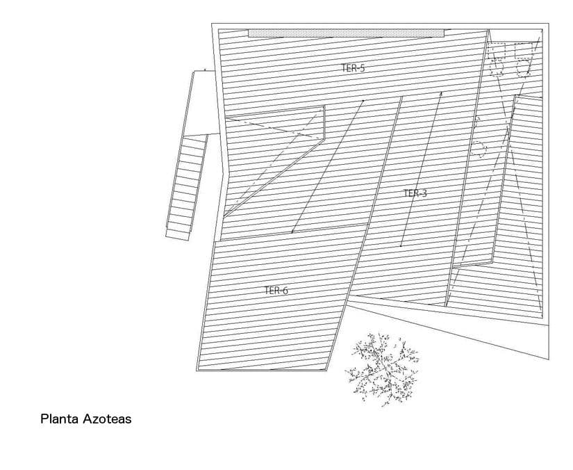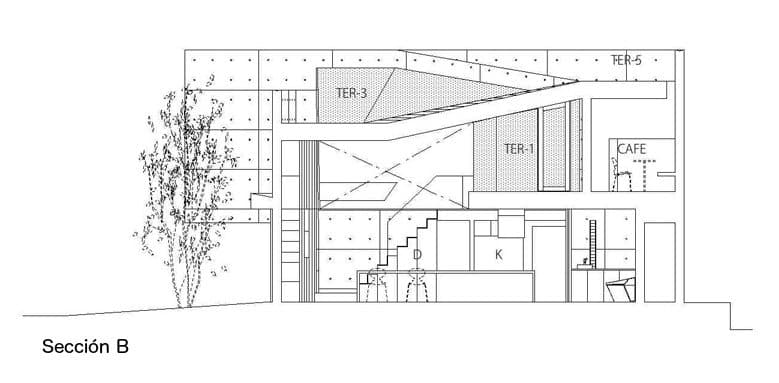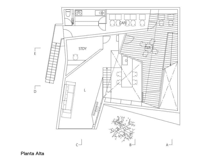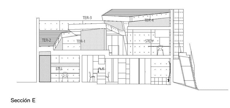 A partir del primer piso, esta casa de hormigón se aparta aún más de convencionalismos. Aquí se ha situado la sala de estar, y un cuarto de estudio que no tiene ventilación alguna (no la hemos visto por ningún lado). Hay una cafetería con entrada independiente desde una escalera exterior, y un bello y original recorrido de losas inclinadas hasta alcanzar el mirador de la azotea.