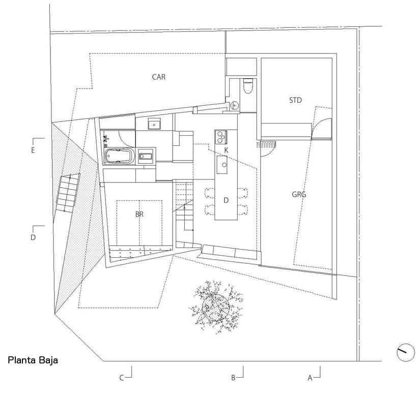 Los 136m2 de su superficie se organizan en dos niveles. Hay espacios que difícilmente respetan encuentros ortogonales entre sus paredes. La cocina está colocada en el centro de la planta baja, permitiendo que desde ella se domine visualmente el resto, pues se trata de un espacio que tiene doble altura. El mueble isla se utiliza también para comer, pero para eventos familiares importantes es posible utilizar también el garaje, simplemente plegando un tabique de vidrio. En la parte trasera de la casa es posible también dejar el coche, pero se trata de un espacio que no está cerrado, solamente protegido por el volumen del primer piso. También en este nivel hay un aseo, el cuarto de baño, varios armarios (algunos de ellos accesibles desde el exterior); una habitación contigua al garaje (sin ventana); y el único dormitorio que tiene la vivienda.
