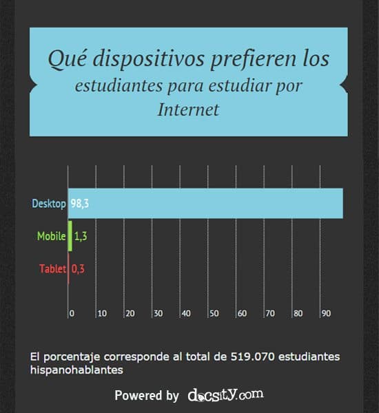 A pesar de que la gente de Docsity tiene una aplicación para tabletas y teléfonos móviles inteligentes, lo cierto es que la gran mayoría (98,3%) prefiere el ordenador de sobremesa para estudiar por internet. No ocurre lo mismo a la hora de navegar por la red, pues un 66% de la gente que llega a este blog lo hace desde un desktop, un 22,5% llega desde un smartphone, y el 11,6% desde un tablet.