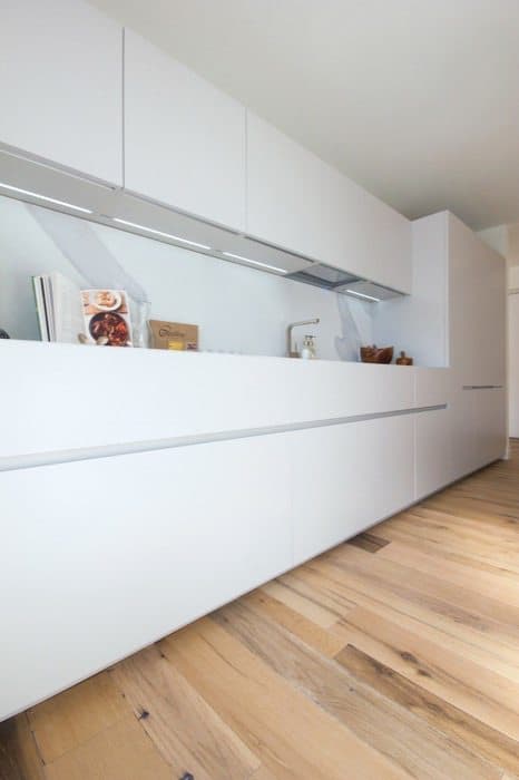 Son diseños que encajan a la perfección en la sencilla decoración de estos luminosos y abiertos lofts. Los muebles están acabados con zócalos lacados en mate, laca mate gris de 11 capas. Tienen interiores en melamina gris claro, y cajones con mecanismo de cierre suave. Las encimeras son de mármol blanco, y poseen iluminación LED (de doble intensidad) empotrada en los armarios superiores.