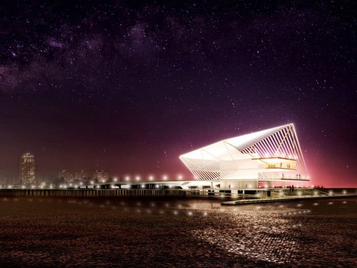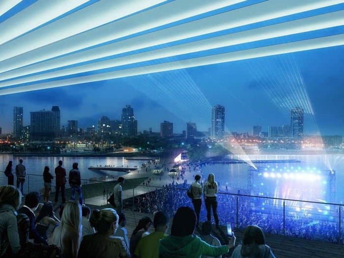 El proyecto de Michael Maltzan («The Lens«) se caracterizaba por suprimir la pirámide invertida que desde 1973 presidía el muelle, y sustituirla por una singular estructura de hormigón (con forma de lente). Tenía conexiones hacia el nuevo paseo marítimo y el centro de la ciudad. Pero en agosto del 2013 un grupo de ciudadanos denominado «Stop the Lens» consiguió cancelar el contrato que el ayuntamiento tenía con el autor del proyecto. De nada sirvieron las modificaciones realizadas para reducir su presupuesto, y añadir más superficie con sombras. Fue determinante un informe científico que calificaba de poco realista el jardín de arrecife planificado.