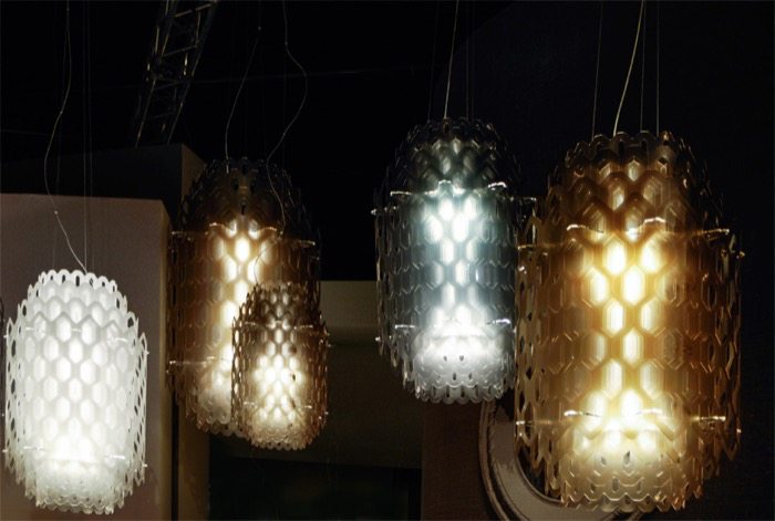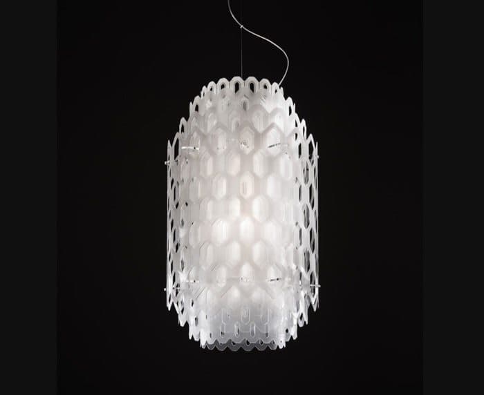 Las originales lámparas colgantes CHANTAL surgieron del reto de utilizar un elemento bidimensional para crear un volumen. Con ello se consiguió una interesante ilusión óptica, a partir de múltiples capas de un material translúcido perforado.