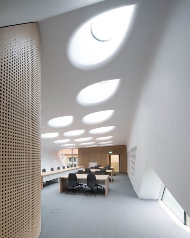 Aparte del buen acabado general que presenta el edificio, resulta muy interesante comprobar cómo se ha resuelto finalmente el interior de la biblioteca. También nos interesa la sala de conferencias, y aquellos elementos más peculiares, como son las claraboyas con formas de gota. Afortunadamente la realidad ha igualado, incluso superado, a lo que se mostraba en los renders del proyecto.