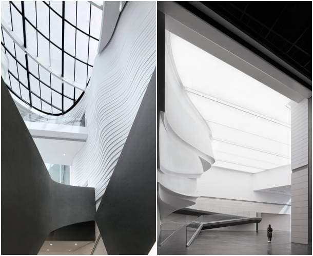 Si el resultado exterior es atractivo, el interior no se queda atrás. El edificio presenta un gran vacío central que divide al museo en dos. Atravesando la grieta que sirve para definir la puerta principal de acceso, encontraremos un atrio de circulación que ocupa toda la altura del edificio. Está inundado de luz cenital, y con las paredes también labradas por la misma acción que ha definido las fachadas.