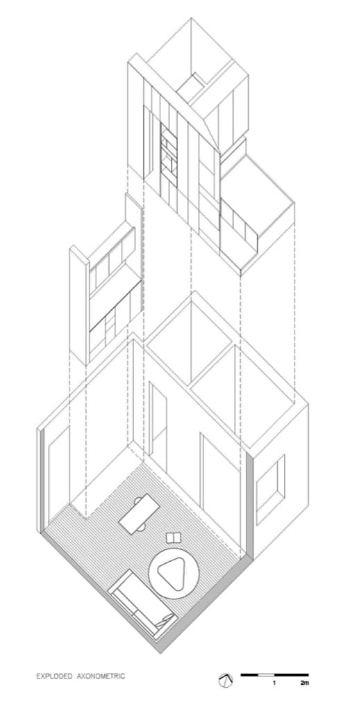 Como se puede ver en la axonometría que hemos incluido en la galería de fotos, el dormitorio tiene también espacio de almacenamiento en el piso, por eso aparece un escalón. El aparato de televisión está encajado en uno de los huecos del compacto mueble que hay en la pared, al igual que una estantería, el armario para las botellas, etc. Tanto la puerta del baño como la del dormitorio pueden deslizar por delante. De esta manera se maximiza la superficie útil del apartamento, al tiempo que quedan perfectamente integradas, y casi ocultas, cuando se quiere cerrar el paso.