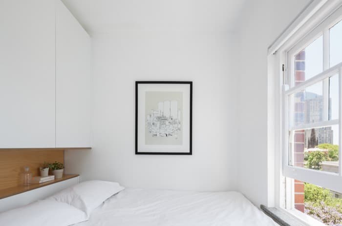La solución pasó por cambiar la posición de la cocina, para colocar en su lugar el nuevo dormitorio. Tiene espacio justo para la cama de matrimonio, pero creando una división que separa perfectamente las funciones diarias con las de la noche. Dicho de otra manera: separando lo público de lo privado. Pero la grandeza de este trabajo la encontraremos precisamente en cómo se han definido los armarios. Están adosados a la tabiquería, creando unos sencillos muebles minimalistas, con puertas pintadas de blanco, tanto en el salón como el dormitorio.