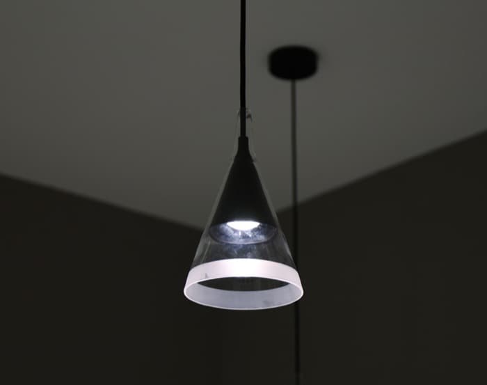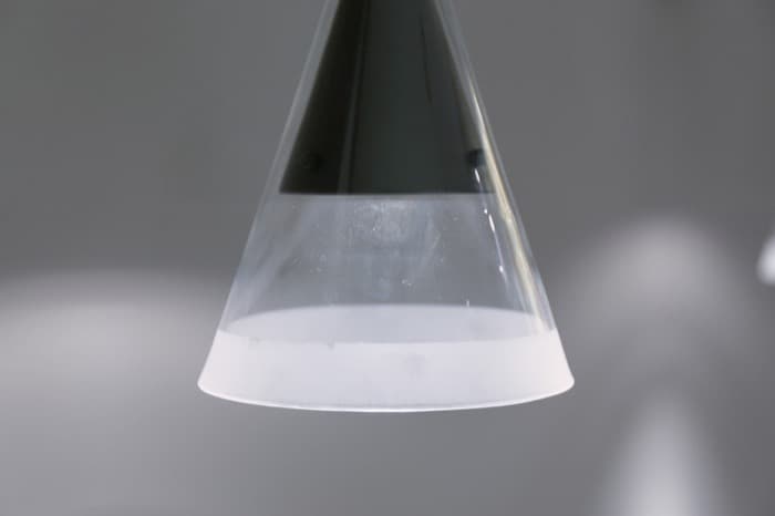 La pantalla de esta lámpara está compuesta por dos conos superpuestos, uno dentro de otro, y de materiales diferentes. El cono interior está fabricado en metal negro, mientras que el exterior es de vidrio borosilicatado transparente, que es más difícil de producir, pero más duradero y resistente al calor que el vidrio convencional.