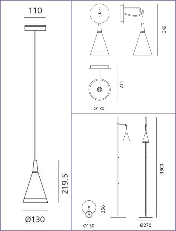 - Vigo Tierra. Va colgada de un mástil negro, para utilizarse como una lámpara de pie. Se puede regular la altura a la que se cuelga.