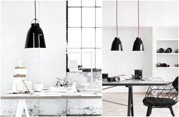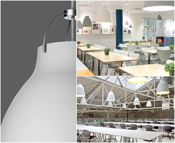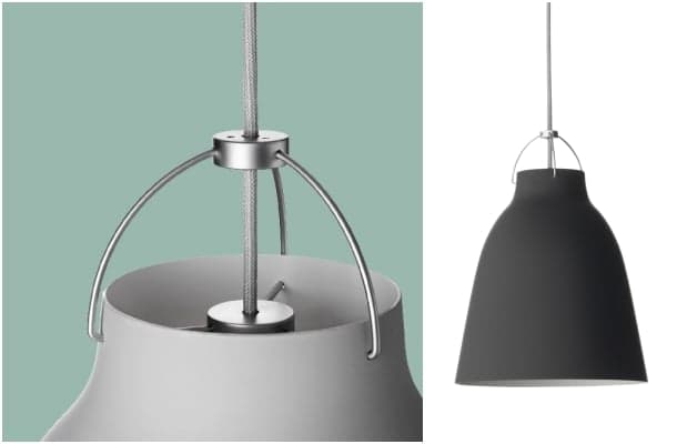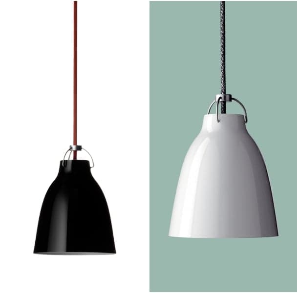 Está disponible en dos versiones de color (blanco o negro, con algunos matices que veremos más adelante). Pero su cable de conexión (de acabado textil) puede aportar una nota de color a todo el conjunto. La lámpara proyecta su luz hacia abajo, aunque también ilumina la suspensión y el cable a través de un hueco que tiene en su parte superior.